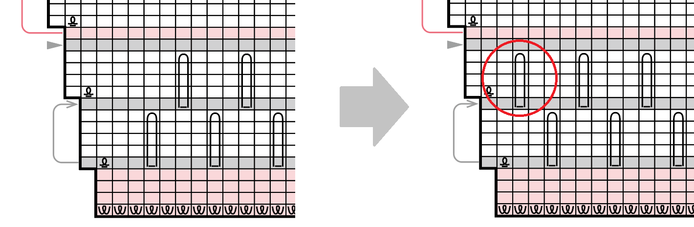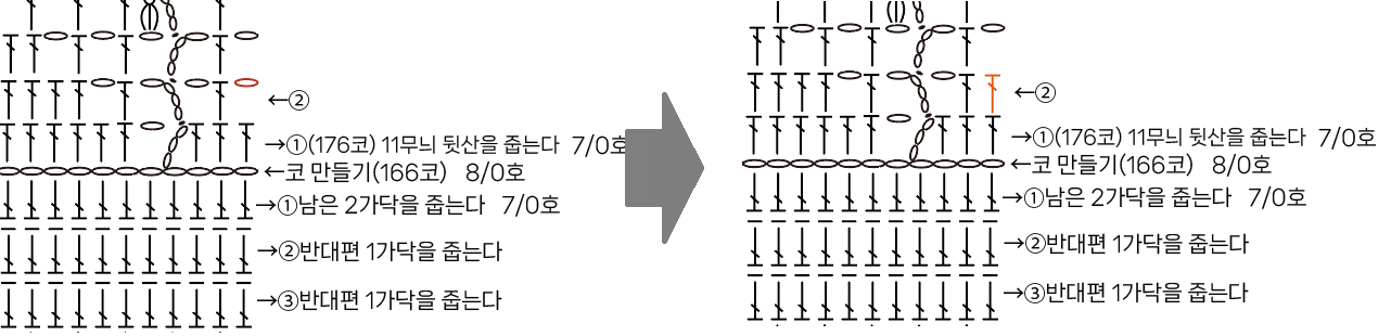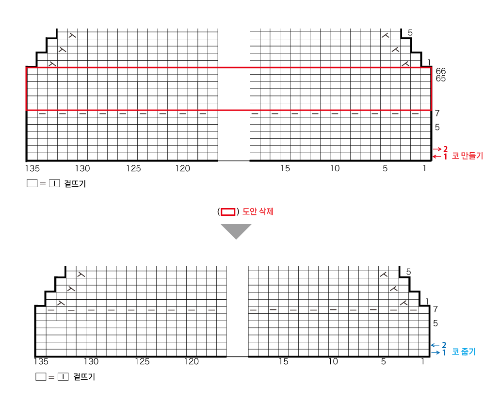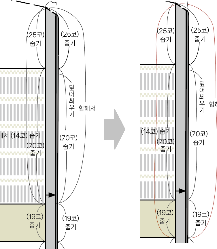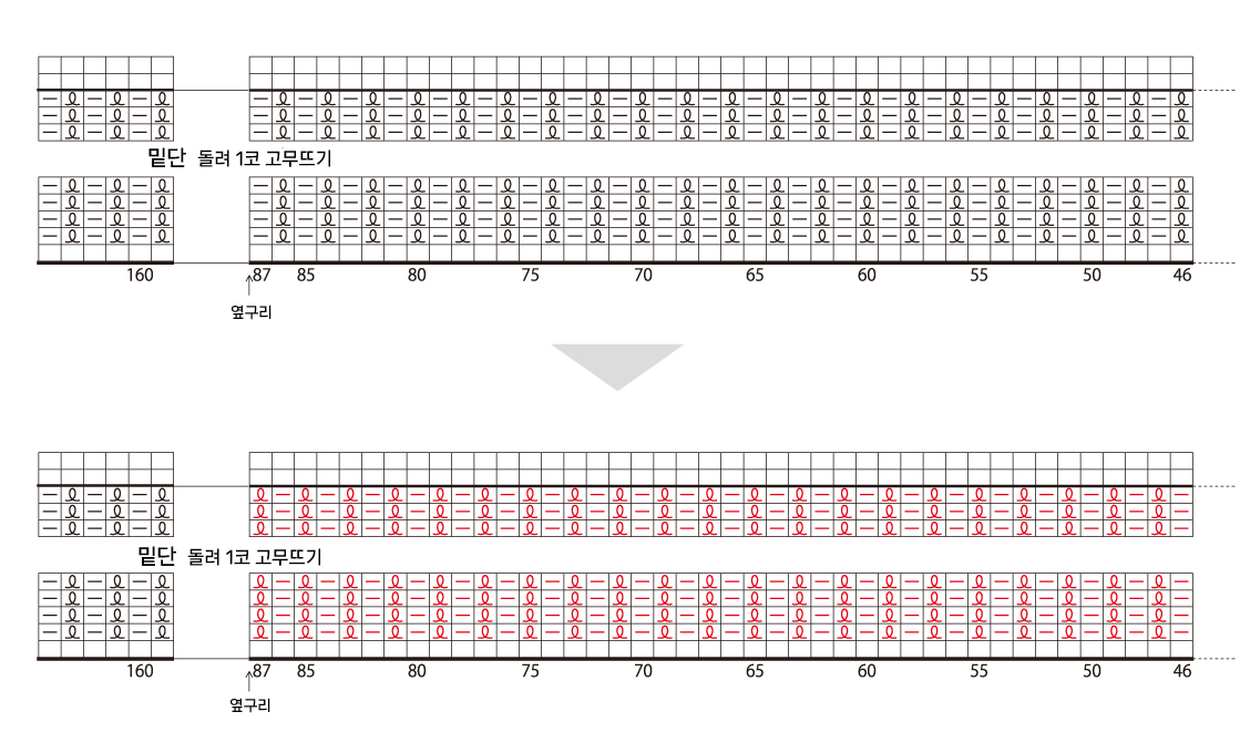 3페이지 오른쪽 앞몸판 105단 겉뜨기 -> 왼코 겹쳐 2코 모아뜨기